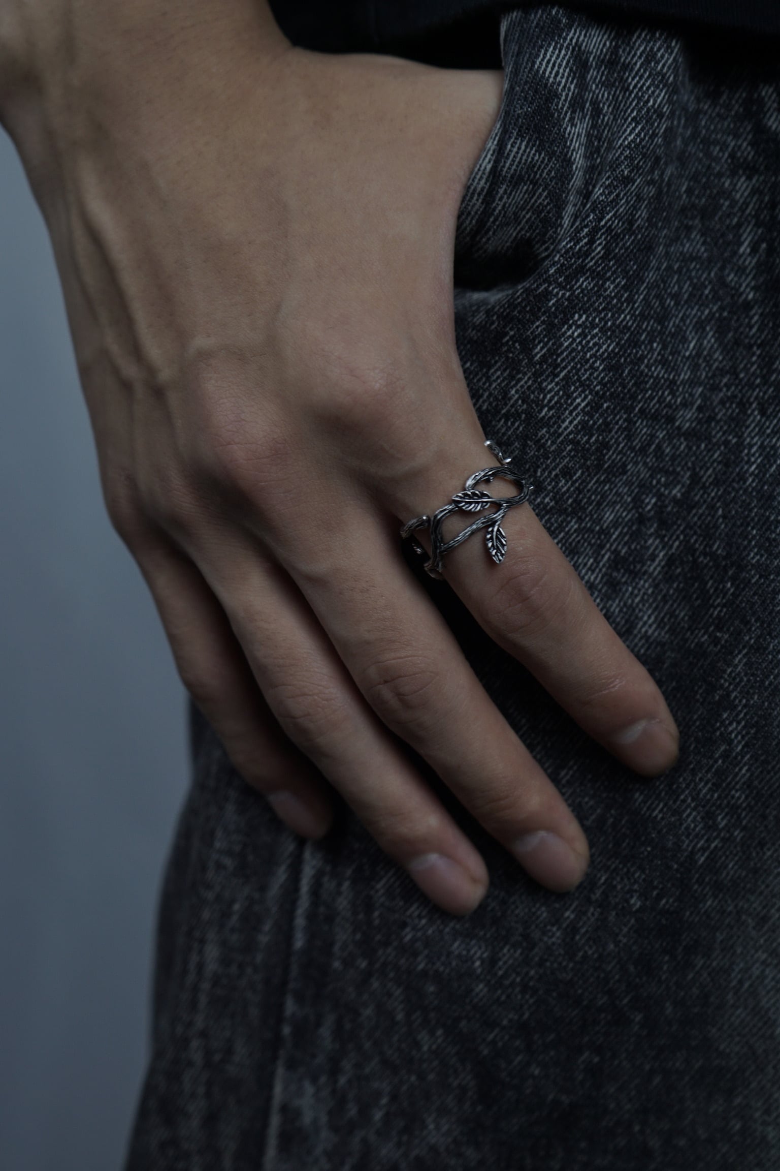 この指輪は、「自然との一体感」をテーマにデザインされました。絡み合う枝と葉が織りなす有機的なフォルムは、生命の力強さと繊細さを同時に表現しています。無骨さを残しつつも、葉の曲線や質感に繊細な職人技が光り、自然の中に宿る秩序と美を象徴しています。あえて左右非対称に構成された枝は、自然の不完全さが持つ美しさを強調し、身につける人の個性と調和します。この指輪は、都会の中でも自然を感じたいと願う人へ贈る、静かなる自然の証です。