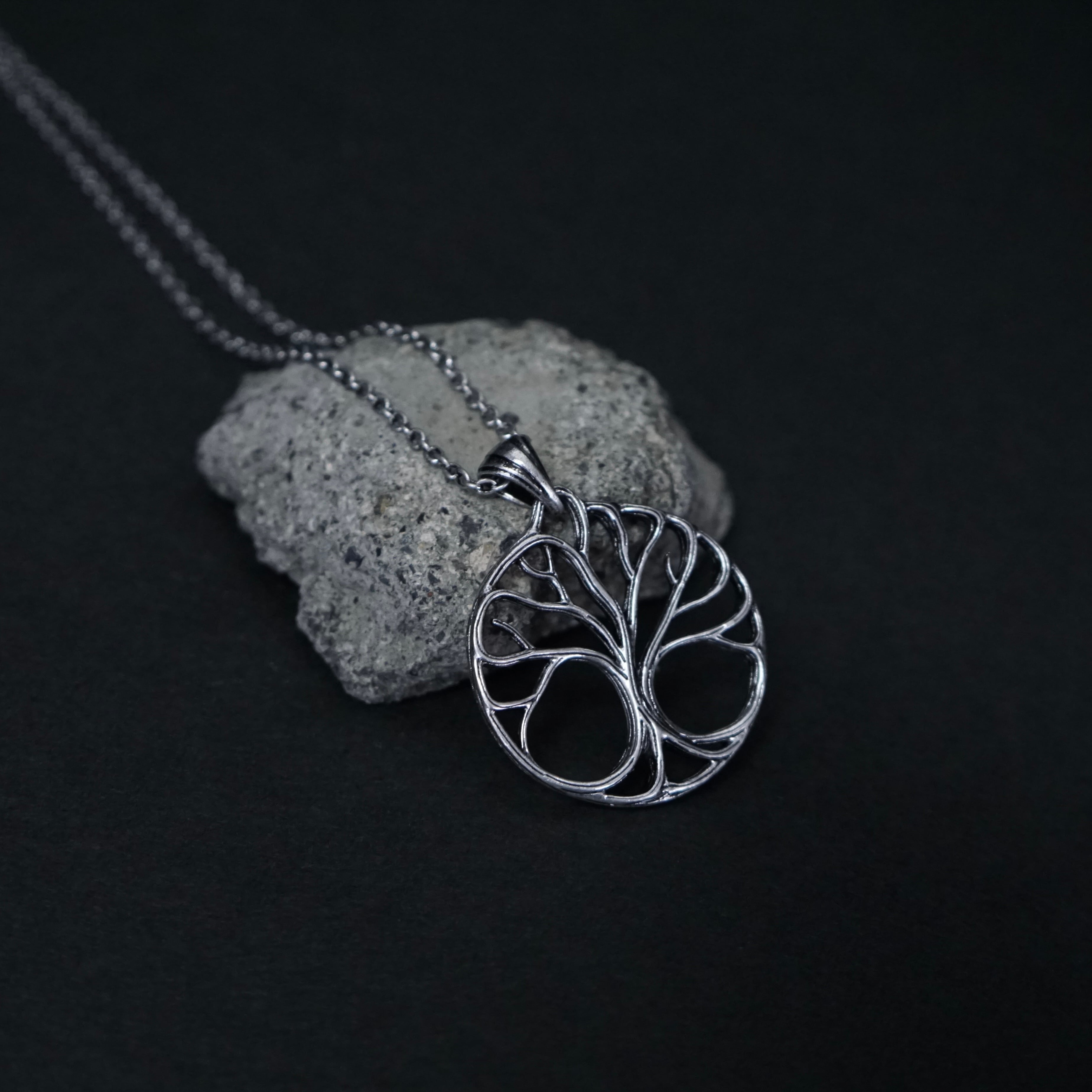 このネックレスは、ブランド名「TreeStone」にふさわしく、「根源とつながりの象徴」としてデザインされています。丸い輪の中に広がる木のシルエットは、生命の樹をモチーフにしており、大地に深く根を張りながら、枝は自由に空へと伸びていく様子を表現。これは、揺るがぬ土台と、自由な精神の両立を意味しています。シンプルながら有機的な曲線美が、自然との調和と普遍的な美を感じさせ、性別や時代を問わず身につけられる、アイコニックなペンダントです。