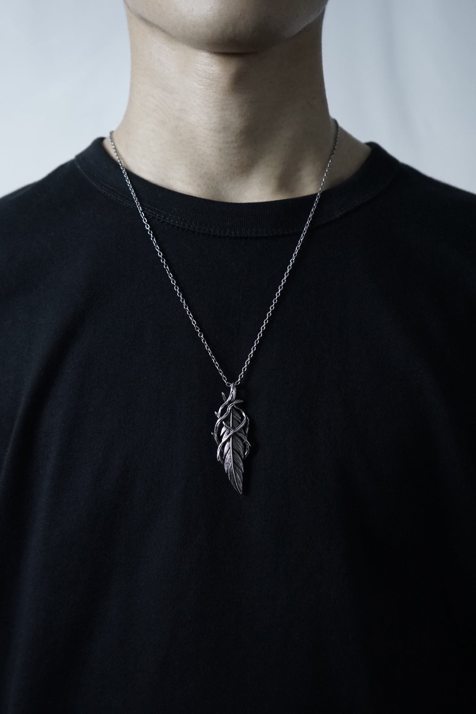 このネックレスは、「風の記憶と大地の束縛」をテーマにデザインされています。繊細な羽根は自由・希望・祈りの象徴でありながら、絡みつく枝は現実や運命、あるいは時間の制約を表現しています。この相反する二つのモチーフが共存する造形は、自由を求めながらも地に足をつけて生きる人間の姿そのもの。羽根の流れるような彫刻と、枝の無骨な質感とのコントラストが、強さと儚さのバランスを美しく描き出し、静かに語りかけるような芸術性を放つ一品です。