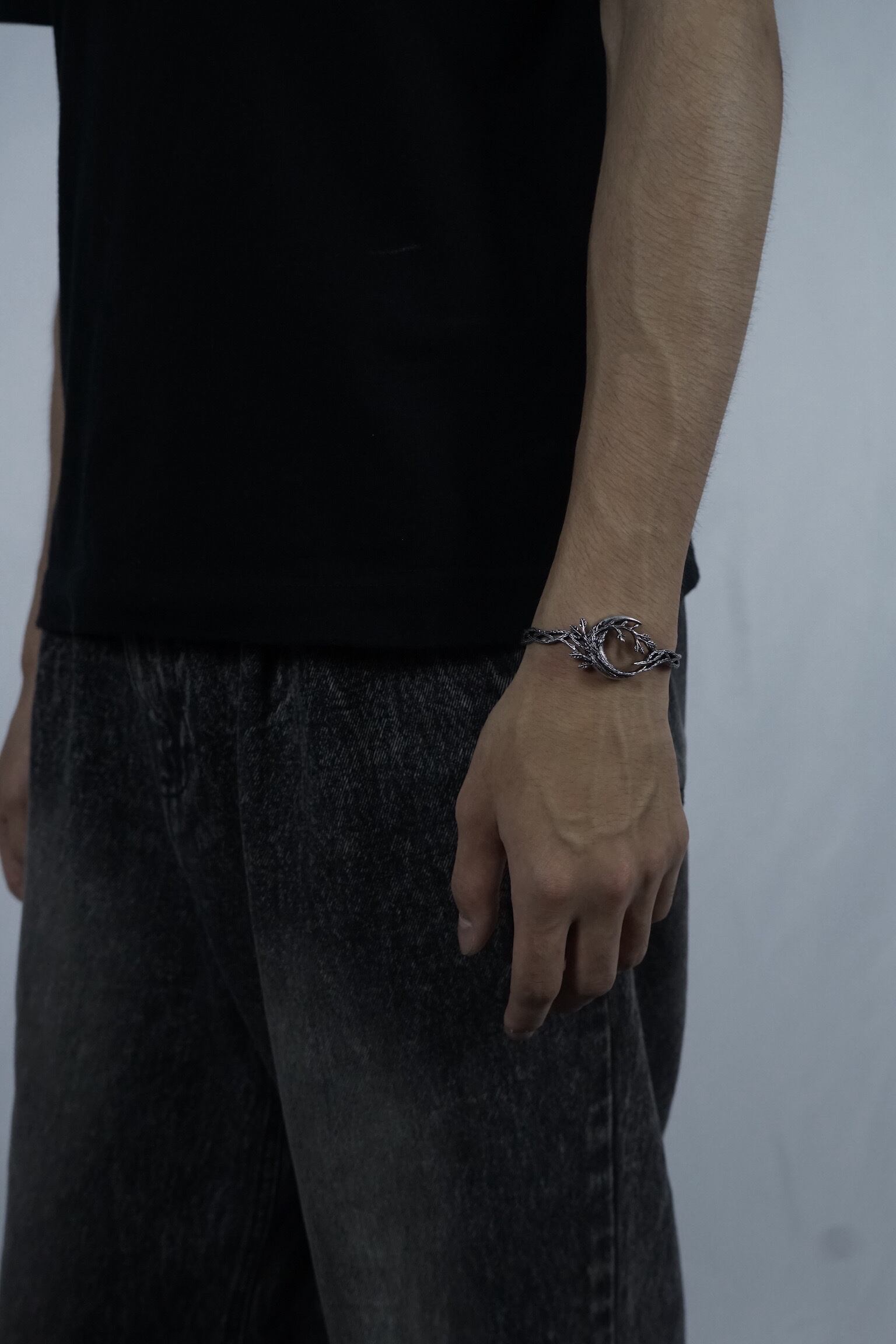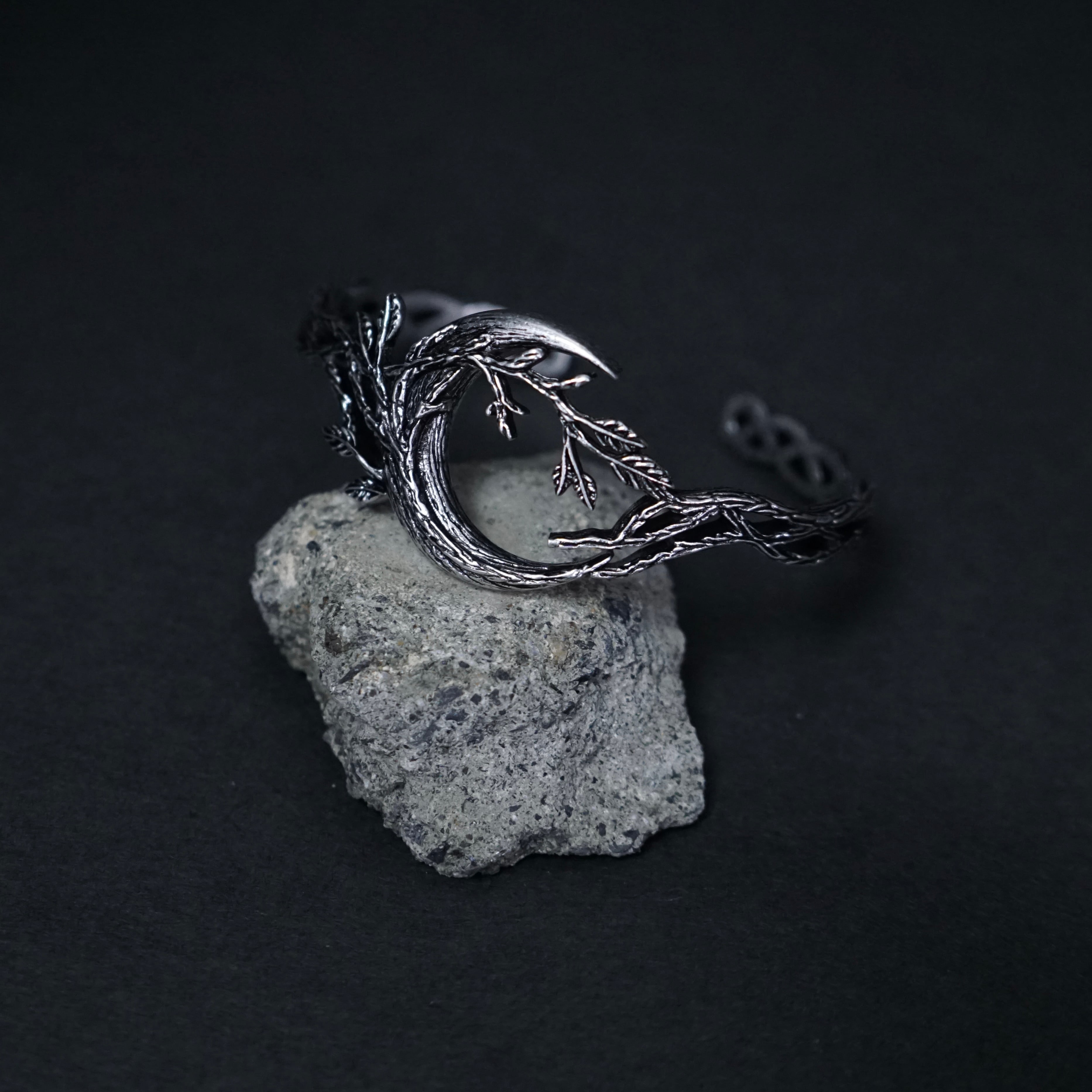 このバングルは、「月と樹の交響」をテーマにした幻想的なデザインです。中央に配された三日月は、静寂や直感、夜の神秘を象徴し、そこに絡みつく枝と葉は生命の営みや自然との調和を表現しています。月を抱きしめるように伸びる枝の造形は、静かな中にも力強い意志を感じさせ、装飾としての美しさだけでなく、内面の深さや精神性を語りかける存在となっています。暗闇の中でそっと光る月のように、控えめでありながらも確かな存在感を放つバングルです。